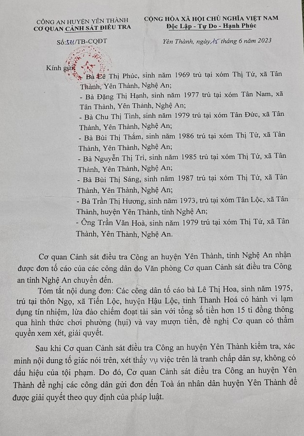 Theo những người chơi hụi ở đây, vào đầu tháng 6/2023 vừa qua, người dân đã làm đơn gửi lên Công an huyện Yên Thành. Đến ngày 9/6, Công an huyện Yên Thành có thông báo trả lời đơn với nội dung “không thụ lý đơn”, đồng thời hướng dẫn họ chuyển đơn sang Tòa án để giải quyết dựa trên Nghị định 19/2019/NĐ-CP của Chính phủ “quy định về họ, hụi, biêu, phường”.