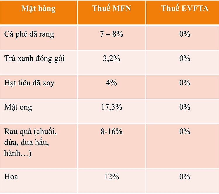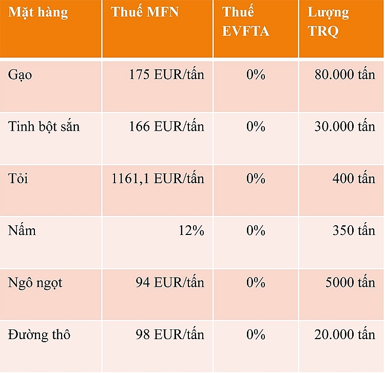 Ngoài việc dỡ bỏ hoàn toàn thuế nhập khẩu với hầu hết các mặt hàng trong vòng 5-7 năm, EU dành hạn ngạch thuế quan với mức thuế trong hạn ngạch 0% cho những mặt hàng còn lại mà Việt Nam có tiềm năng xuất khẩu như gạo, đường thô, ngô ngọt, tỏi, nấm…. Các cơ chế thuận lợi hóa thương mại có tác động trực tiếp tới xuất khẩu nông sản bao gồm thống nhất các quy định về kiểm dịch và vệ sinh an toàn thực phẩm, đơn giản hóa thủ tục cấp và kiểm tra chứng nhận xuất xứ,…