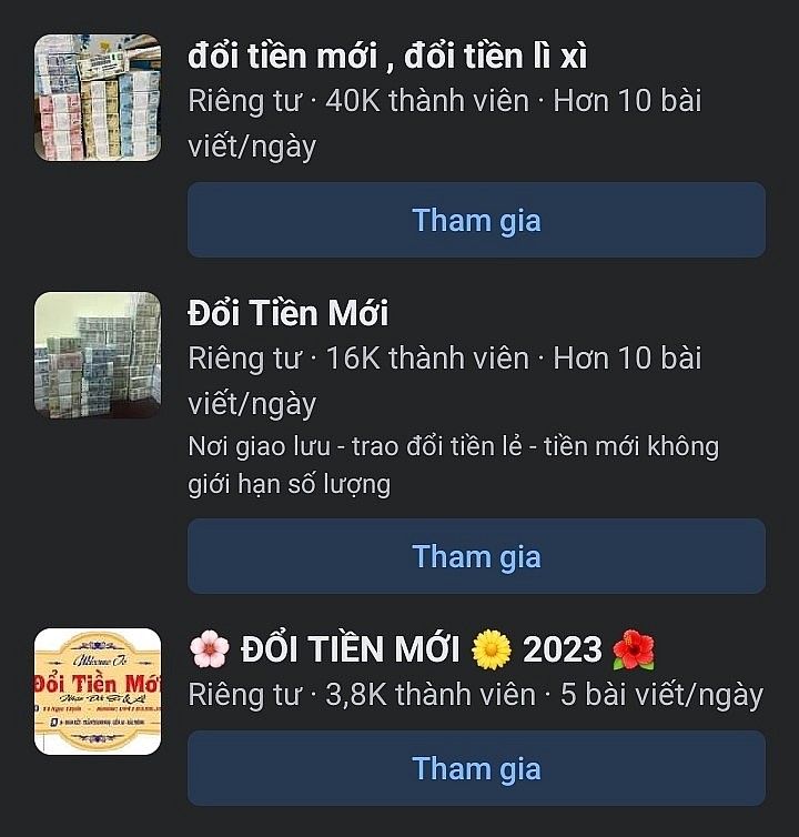 Trên mạng xã hội, người dùng dễ dàng tìm được hàng loạt hội nhóm đổi tiền lẻ, tiền mới với số lượng thành viên đông đảo. Không chỉ liên tục đăng tải bài viết giới thiệu dịch vụ đổi tiền, các bình luận liên quan cũng nhộn nhịp không kém.