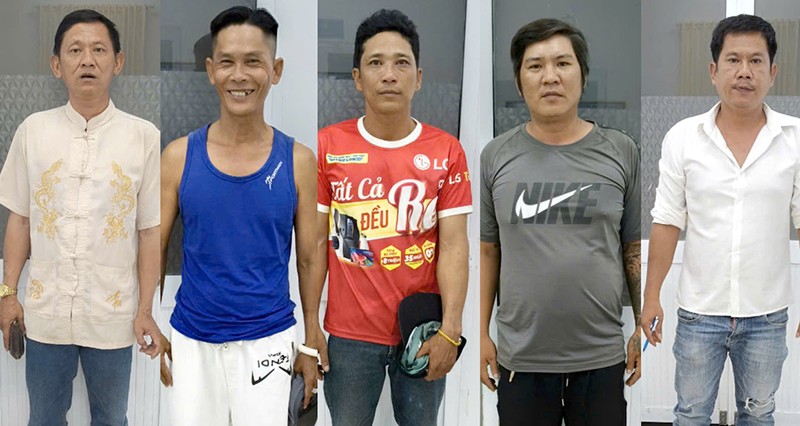 | Các bị can Tính, Hiếu, Kỉnh, Lũy và Phước (từ trái qua) tại cơ quan công an. Ảnh: Công an tỉnh Đồng Tháp |
