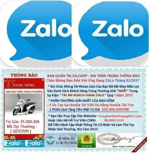 Khoảng 1 năm trở lại đây, nhiều người sử dụng ứng dụng Zalo trên điện thoại đã nhận được thông báo trúng thưởng từ tài khoản Zalo với giải thưởng gồm: “1 chiếc xe SH 150i, 1 phiếu quà tặng tiền mặt 200 triệu đồng, 1 phiếu sử dụng xăng dầu miễn phí 1 năm của Petrolimex”.