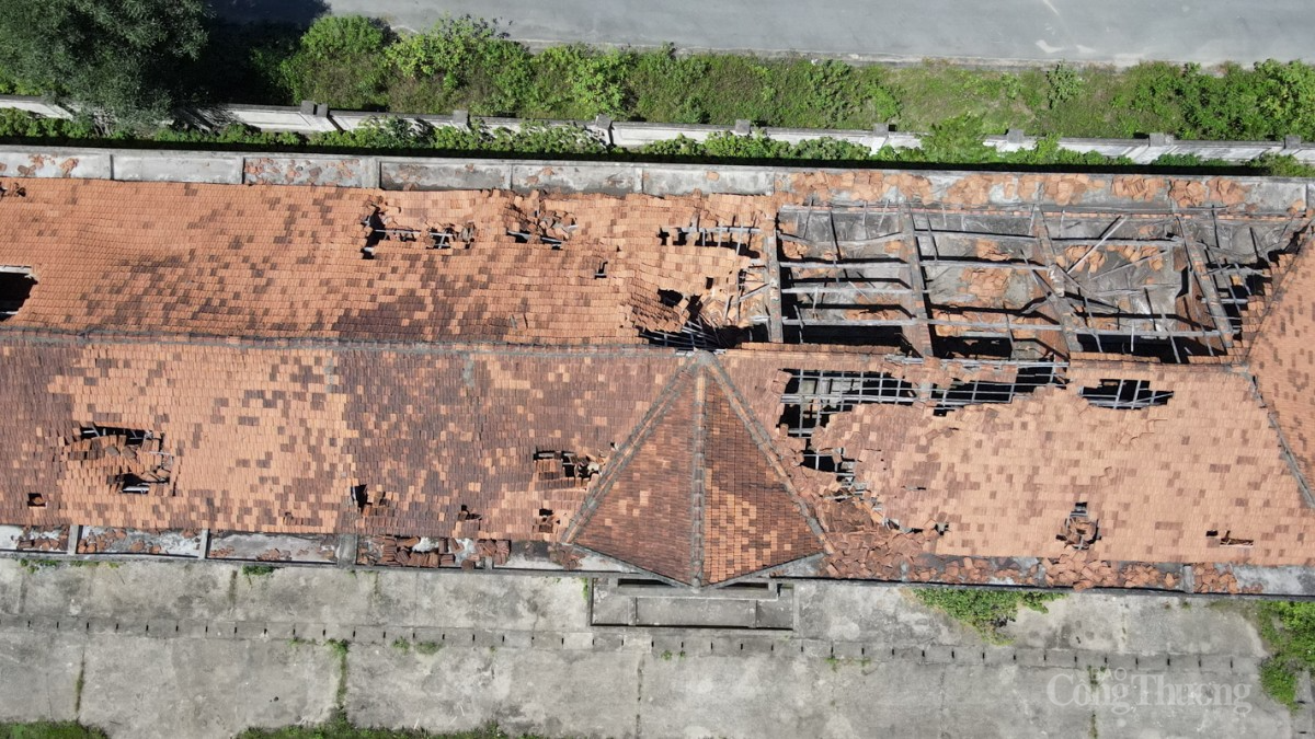 | Nhiều phần mái nhà đã hư hỏng, dột nát nghiêm trọng. Các kèo bị gãy đổ khiến nước tràn vào nền nhà |