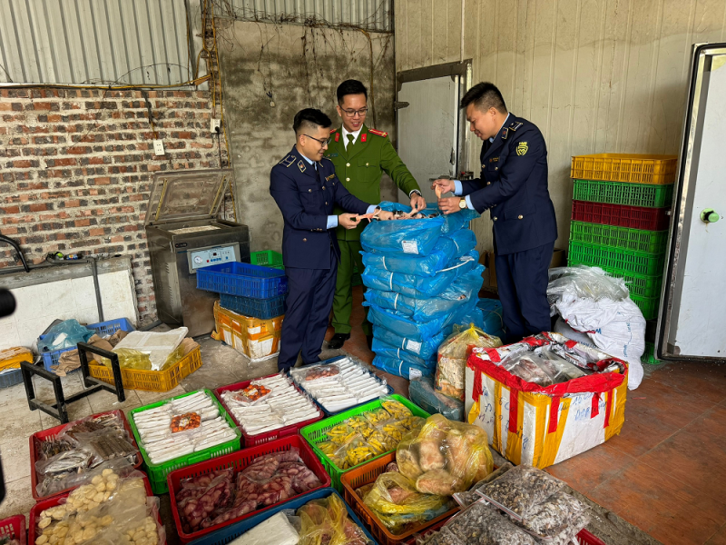 Tại thời điểm kiểm tra, lực lượng chức năng phát hiện trong kho hàng chứa một lượng lớn thực phẩm đông lạnh không rõ nguồn gốc, xuất xứ gồm: Trứng gà non đông lạnh, kê gà đông lạnh, dế mèn đông lạnh, đậu viên thả lẩu, khoai lang sấy, chân gà đông lạnh, xương cá hồi, thịt trâu khô, ốc đông lạnh, cá biển đông lạnh… có hiện tượng chảy nước, bốc mùi hôi thối.