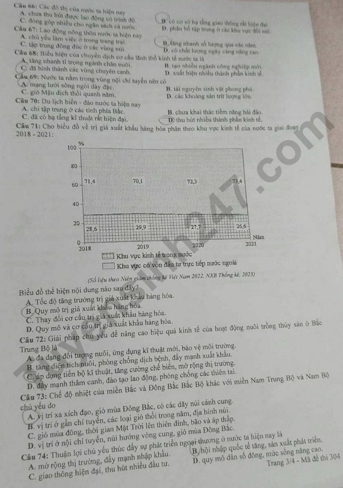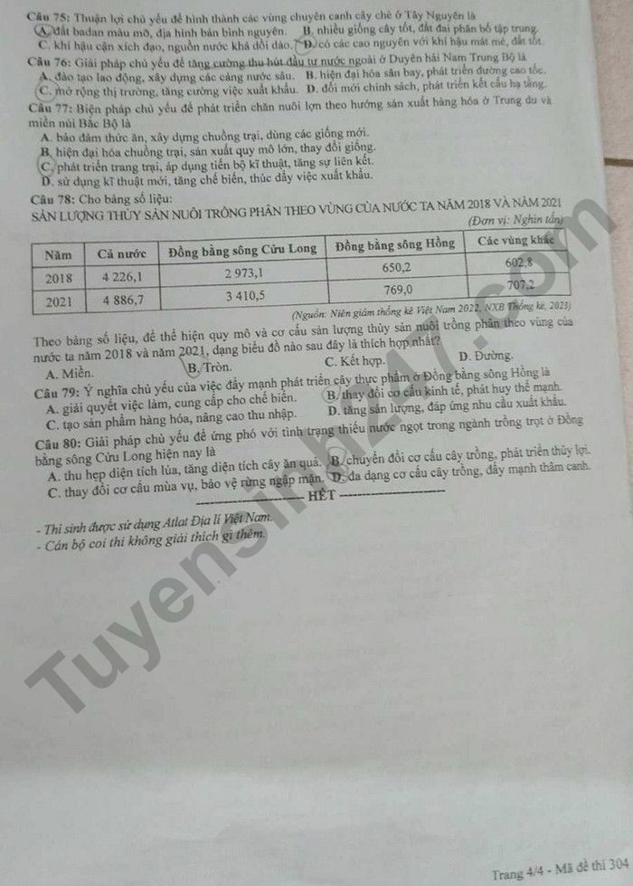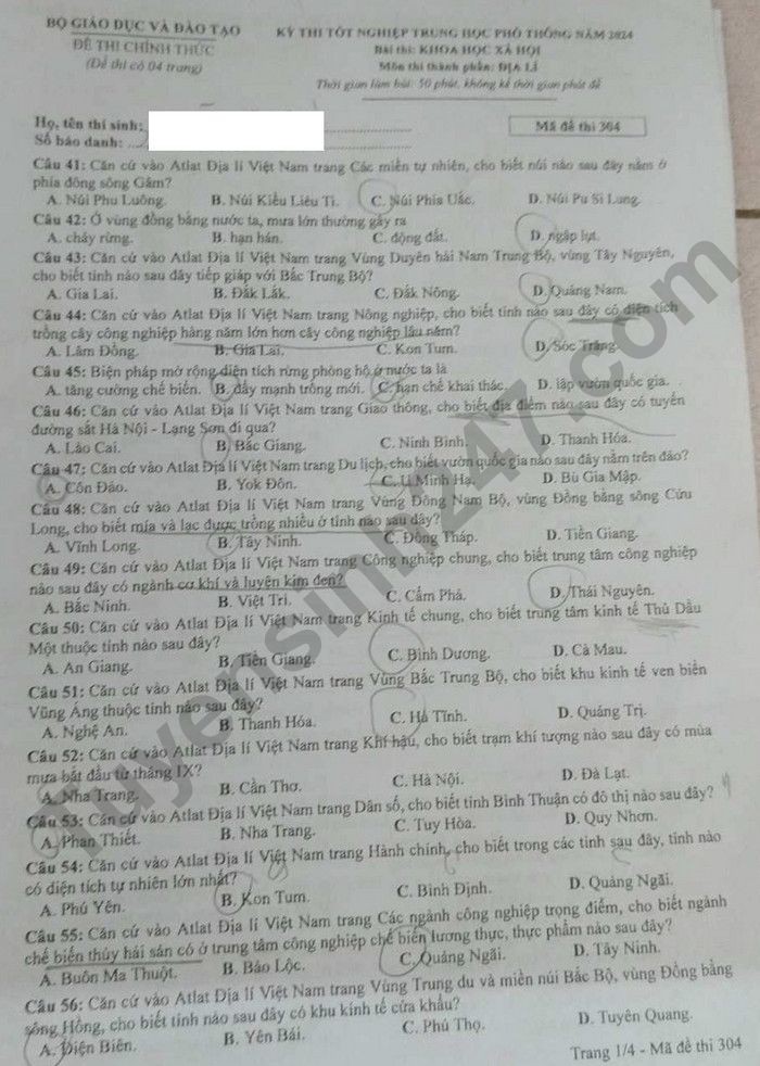 Đề thi môn Địa lý, mã đề 304