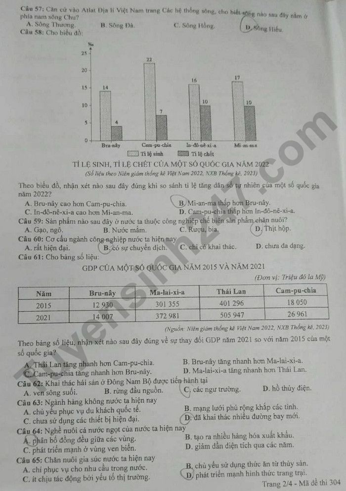 Đáp án đề thi tốt nghiệp THPT 2024 môn Địa lý - Mã đề 304
