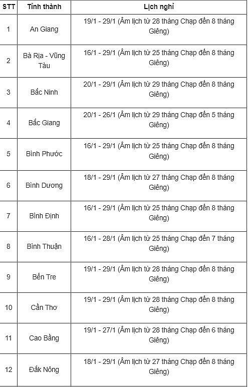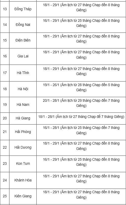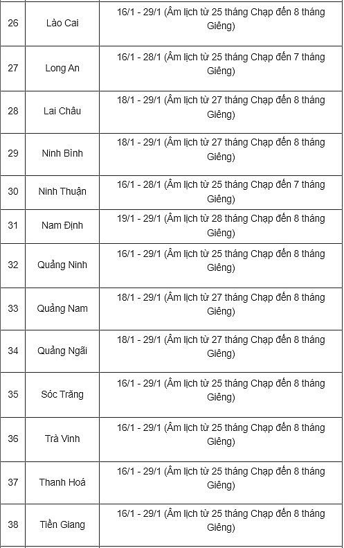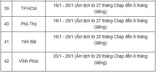 Lịch nghỉ Tết Nguyên đán của học sinh 42 tỉnh, thành phố như sau: