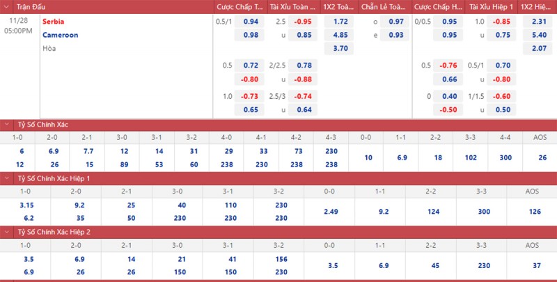 Trong khi đó, tỷ lệ tài xỉu trận đấu này là 2 1/4. Theo đánh giá đây sẽ là trận đấu mà Serbia sẽ chơi tấn công trong khi đó Cameroon hoàn toàn có khả năng sẽ chọn cách nhập cuộc với đội hình thấp.