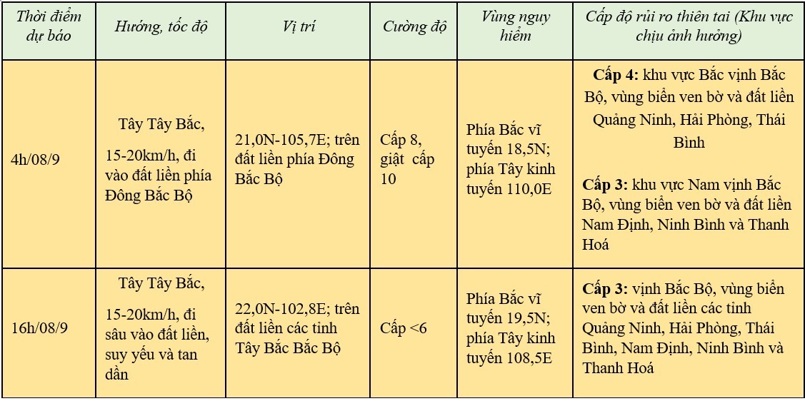 Theo Trung tâm Dự báo khí tượng thủy văn quốc gia: Hồi lúc 17 giờ ngày 7/9, vị trí tâm bão: Khoảng 20.9 độ Vĩ Bắc; 106.3 độ Kinh Đông, trên đất liền Quảng Ninh – Hải Phòng – Hải Dương. Sức gió mạnh nhất: Cấp 11-12 (103-133km/h), giật cấp 15. Dự báo: Trong 3 giờ tới, bão di chuyển theo hướng Tây, tốc độ khoảng 20km/h.