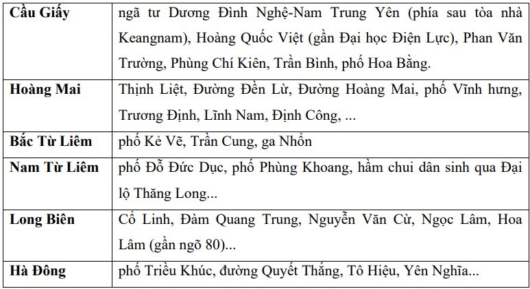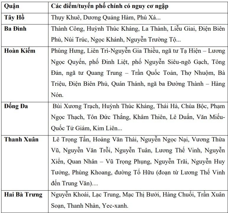 Cảnh báo: Đợt mưa này có khả năng sẽ gây ngập úng cho nhiều tuyến phố nội thành với độ sâu phổ biến từ 20-40cm; Đáng chú ý một số tuyến phố có khả năng ngập sâu hơn với độ sâu từ 30-50cm bao gồm: