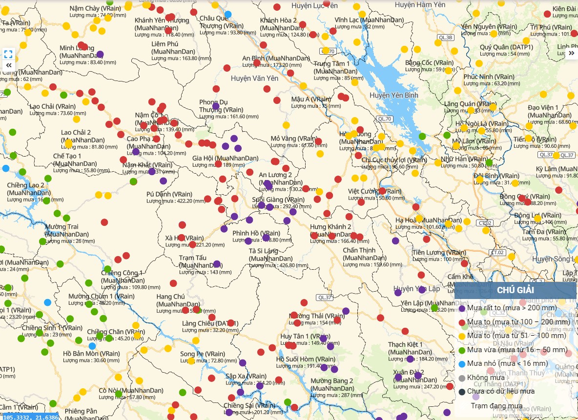 Trong 24 giờ qua, do ảnh hưởng mưa bão số 3 tại Yên Bái đã có mưa rất to, tổng lượng mưa đo được phổ biến từ 100-250mm, đặc biệt có nơi trên 400mm (huyện Trạm Tấu, huyện Văn Chấn).