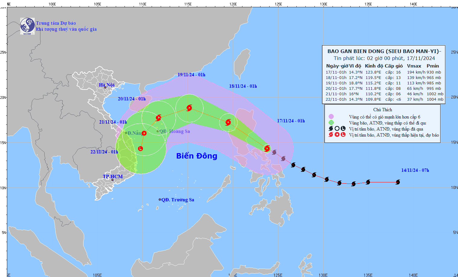 Dự báo thời tiết hôm nay, Theo Trung tâm Dự báo Khí tượng Thủy văn Quốc gia, hồi 01 giờ ngày 17/11, vị trí tâm siêu bão Man-Yi ở vào khoảng 14,3 độ Vĩ Bắc; 123,8 độ Kinh Đông, trên vùng biển phía Đông khu vực miền Trung Philippines. Sức gió mạnh nhất vùng gần tâm siêu bão mạnh cấp 16 (184-201km/h), giật trên cấp 17. Di chuyển theo hướng Tây Bắc, tốc độ 20km/h.