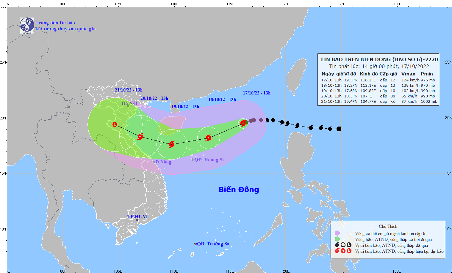 Theo Trung tâm dự báo khí tượng thủy văn quốc gia, hồi 13 giờ ngày 17/10, vị trí tâm bão số 6 ở vào khoảng 19,5 độ Vĩ Bắc; 116,2 độ Kinh Đông, cách quần đảo Hoàng Sa khoảng 520km về phía Đông Bắc. Sức gió mạnh nhất vùng gần tâm bão mạnh cấp 12 (118-133km/giờ), giật cấp 14, di chuyển theo hướng Tây Tây Nam với tốc độ khoảng 15km/h.