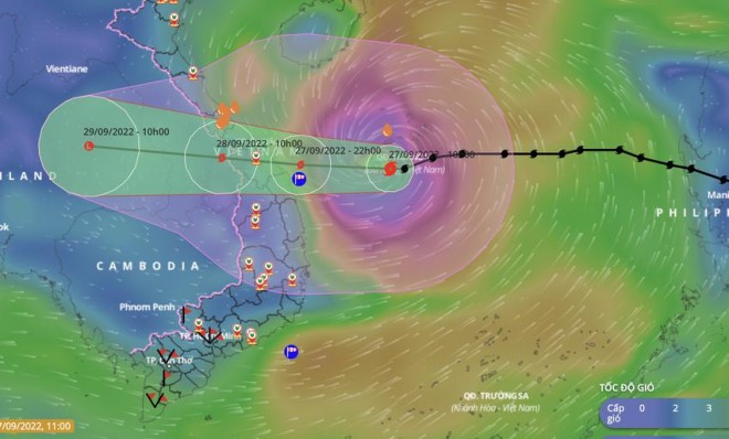 Dự báo trong 12 giờ tới, bão di chuyển chủ yếu theo hướng Tây, mỗi giờ đi được 20-25km. Đến 01 giờ ngày 28/9, vị trí tâm bão ở khoảng 15,7 độ Vĩ Bắc; 108,6 độ Kinh Đông, trên vùng biển Thừa Thiên Huế - Quảng Ngãi. Sức gió mạnh nhất vùng gần tâm bão mạnh cấp 14-15 (150-183km/giờ), giật cấp 17.
