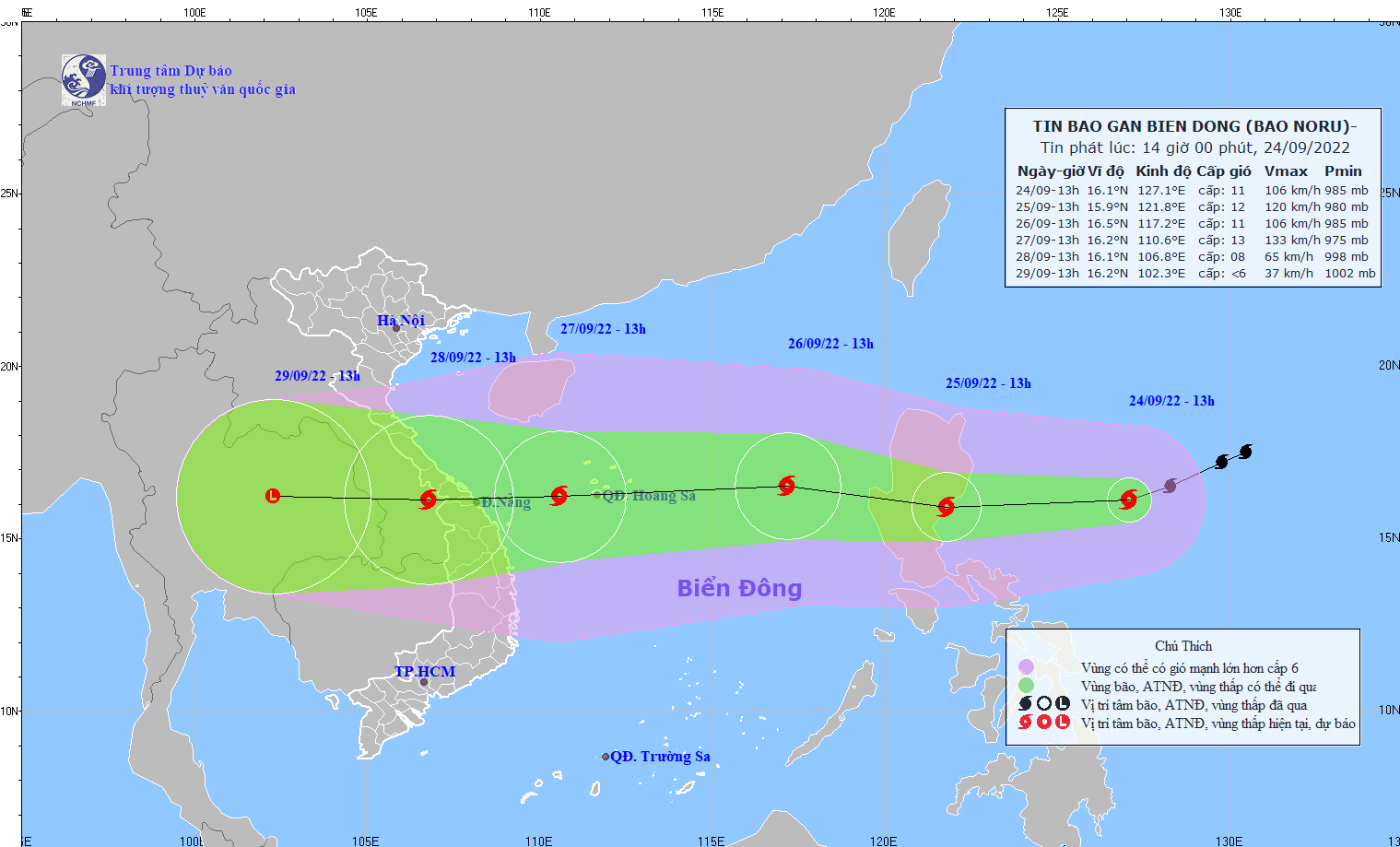 Trong 48 đến 72 giờ tiếp theo, bão di chuyển nhanh theo hướng Tây, mỗi giờ đi được khoảng 30km, có xu hướng mạnh thêm. Đến 13 giờ ngày 27/9, vị trí tâm bão ở khoảng 16,2 độ Vĩ Bắc; 110,6 độ Kinh Đông, cách Thừa Thiên Huế-Quảng Nam khoảng 220km về phía Đông. Sức gió mạnh nhất vùng gần tâm bão mạnh cấp 12-13 (118-149km/giờ), giật cấp 16.