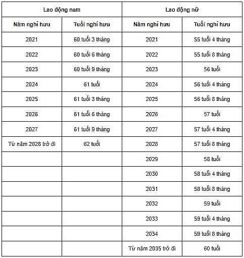 Kể từ năm 2021, tuổi nghỉ hưu của người lao động trong điều kiện lao động bình thường là đủ 60 tuổi 3 tháng đối với lao động nam và đủ 55 tuổi 4 tháng đối với lao động nữ. Sau đó, cứ mỗi năm tăng thêm 3 tháng đối với lao động nam và 04 tháng đối với lao động nữ.