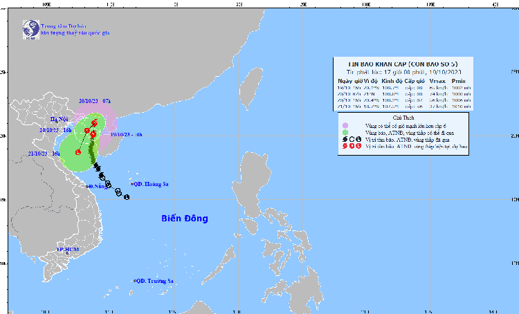 Hồi 16 giờ ngày 19/10, vị trí tâm bão ở vào khoảng 20,3 độ Vĩ Bắc; 108,7 độ Kinh Đông, trên vùng biển phía Đông Vịnh Bắc Bộ. Sức gió mạnh nhất vùng gần tâm bão mạnh cấp 8 (62-74km/giờ), giật cấp 10. Di chuyển theo hướng Bắc với tốc độ khoảng 10km/h.