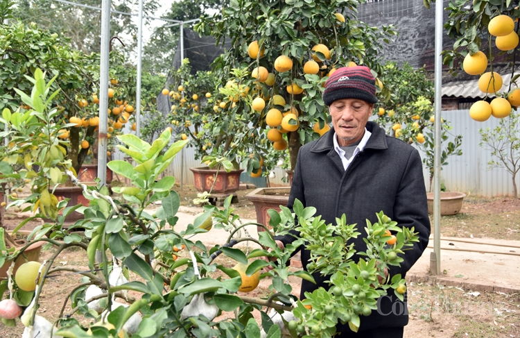 Chỉ cho tôi gốc cây đang mang hàng chục thứ quả trên mình ông Giáp tận tình giảng giải: Thân cây bưởi được chọn làm cây ghép vì gốc to, cành khỏe, có thể ghép được nhiều loại quả cùng họ như cam, chanh, quất, phật thủ. Trong đó, để cho có nhiều màu sắc, thêm sinh động, mỗi loại quả ông lại chọn nhiều giống khác nhau, cùng là cam ông chọn cả cam Canh, cam Cao Phong, cam Vinh; chanh thì có thể ghép cả chanh thường và chanh đào; bưởi thì có bưởi da xanh, bưởi đỏ, bưởi năm roi, bưởi Diễn… Cứ như thế, đến nay ông đã ghép tổng cộng 10 loại quả trên cùng một gốc cây bưởi.