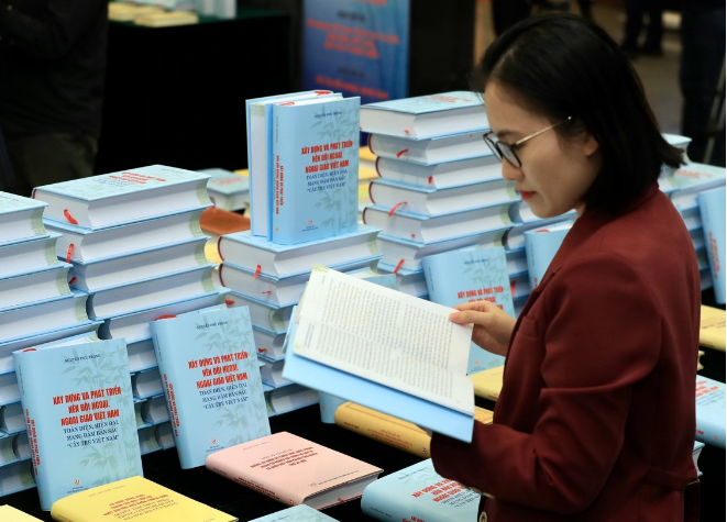 | Cuốn sách Xây dựng và phát triển nền đối ngoại, ngoại giao Việt Nam toàn diện, hiện đại, mang đậm bản sắc "cây tre Việt Nam". Ảnh: Lâm Khánh/TTXVN) |