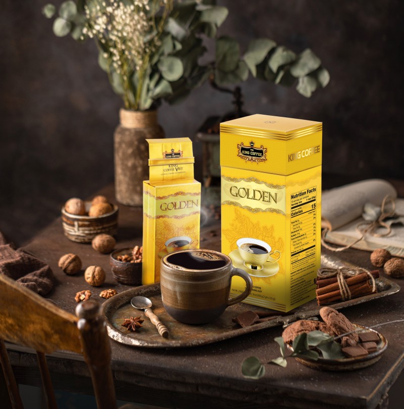 | KING COFFEE GOLDEN, một trong ba sản phẩm thuộc dòng cà phê cao cấp được King Coffee sáng tạo rành riêng cho những người tiên phong mang lại giá trị cao đẹp cho xã hội. Được phối trộn bởi 7 loại hạt cà phê ngon nhất từ 7 vùng trồng nổi tiếng, người dùng KING COFFEE GOLDEN sẽ trải nghiệm một bản hòa tấu tuyệt vời chưa từng xuất hiện ở bất cứ sản phẩm cà phê nào khác. |