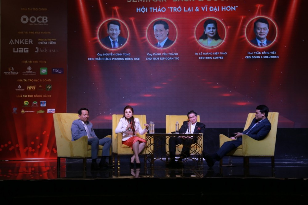 Tham dự tọa đàm có doanh nhân Đặng Văn Thành - Nguyên Chủ tịch Sacombank, nay là Chủ tịch Tập đoàn TTC, doanh nhân Lê Hoàng Diệp Thảo – Đồng sáng lập Tập đoàn Trung Nguyên, Sáng lập kiêm CEO TNI King Coffee, doanh nhân Nguyễn Đình Tùng – CEO Ngân hàng Phương Đông OCB. Host của tọa đàm là CEO Đông Á Solutions Trần Bằng Việt.