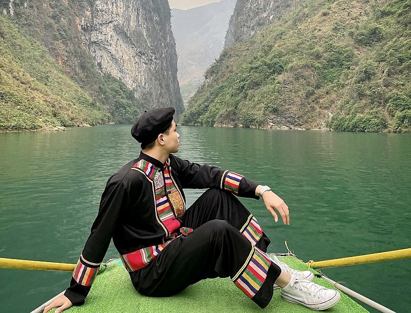 | Khách du lịch chụp ảnh với trang phục truyền thống của một số đồng bào dân tộc tỉnh Hà Giang tại khu du lịch sông Nho Quế. |