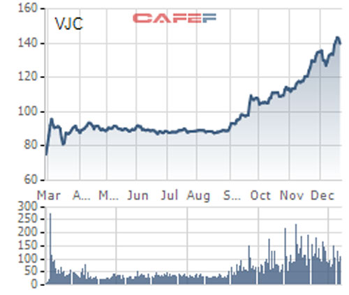 Trong nhóm này, VJC là gương mặt lên sàn sớm nhất và cũng ghi nhận mức tăng giá cổ phiếu hơn 75%, góp thêm vào thị trường hơn 63.000 tỷ đồng.