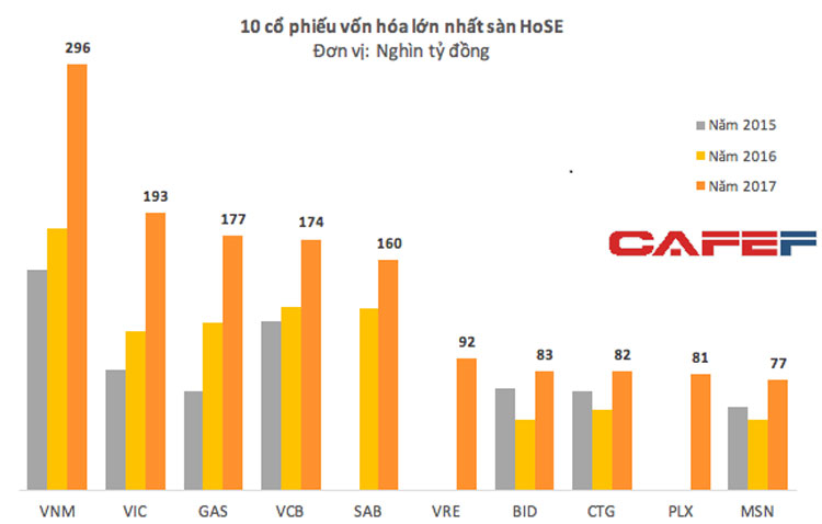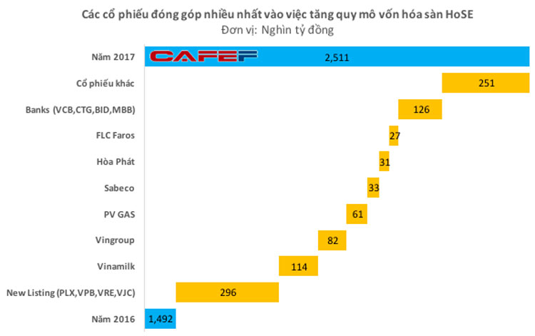 Cùng với sự góp mặt của những bom tấn mới mẻ, dòng tiền cũng đổ mạnh vào thị trường đẩy giá cổ phiếu tăng trưởng ấn tượng. Vì vậy, chỉ tính riêng sàn HOSE thì quy mô vốn hóa thị trường chứng khoán Việt Nam chỉ sau 1 năm đã tăng thêm hơn 1 triệu tỷ đồng. Tính đến ngày 21/12/2017, vốn hóa sàn này đạt hơn 2,5 triệu tỷ đồng, tương đương gần 110 tỷ USD.