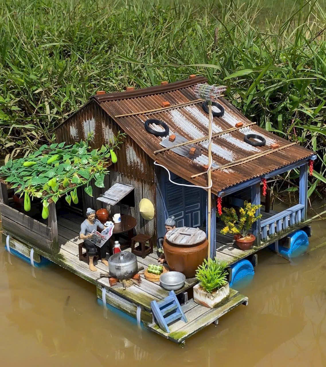 Tùng chia sẻ: “Thời điểm dịch Covid-19, trong lúc làm bể cá, tình cờ xem ti-vi thấy ngôi nhà ở các tỉnh miền Tây Nam Bộ rất thân thương. Do đó, tôi đã làm thử mô hình nhà và bén duyên từ đó”.