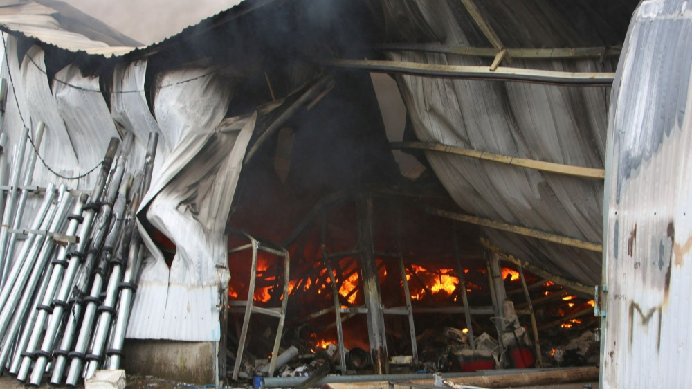Tường, mái nhà của một số nhà xưởng bị đổ sập. Ngọn lửa vẫn cháy ngùn ngụt bên trong nhà kho do có nhiều đồ dễ bắt lửa.