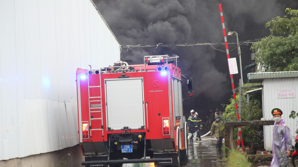 Đến 7h46, đám cháy vẫn bùng lên dữ dội, cột khói đen bốc cao cả trăm mét. Lực lượng Cảnh sát Phòng cháy chữa cháy đã phải dùng búa, rìu phá tường nhà kho để dập lửa.
