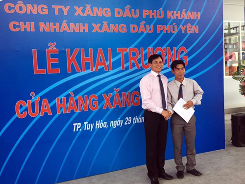 | Bí thư Đảng ủy, Chủ tịch kiêm Giám đốc Petrolimex Khánh Hòa - Lê Tiến Duẩn (trái) trao quyết định cho Cửa hàng trưởng CHXD số 24 |