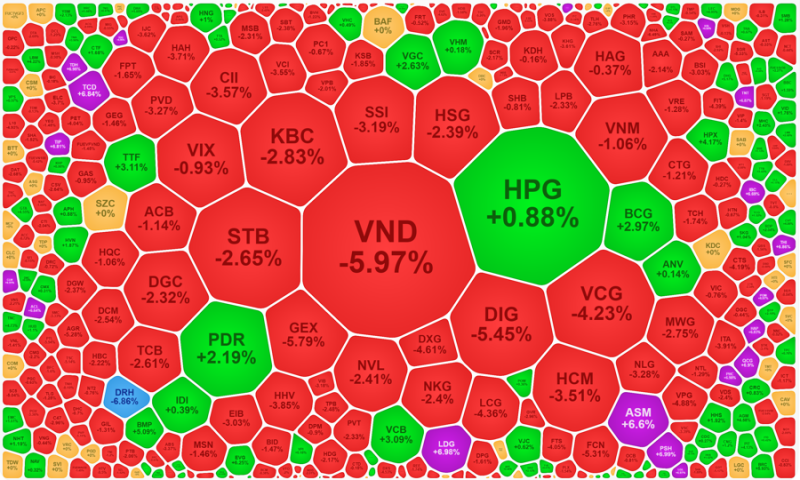 Nhóm bất động sản cũng chịu chung số phận. Cụ thể, NVL giảm 2,41%, KBC giảm 2,83%, DIG giảm 5,45%, NLG giảm 3,28%, VCG giảm 4,23%, DXG giảm 4,61%, ITA giảm 3,91%, CII giảm 3,57%, HHV giảm 3,85%. Tuy nhiên, vẫn có một số mã ngược dòng tăng kịch trần như QCG, TCD, TIP, LDG.