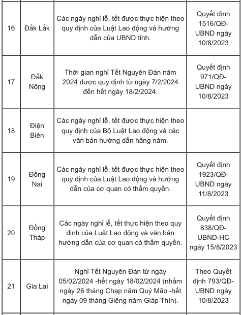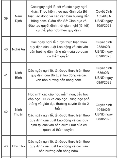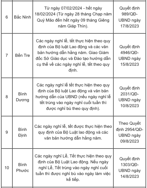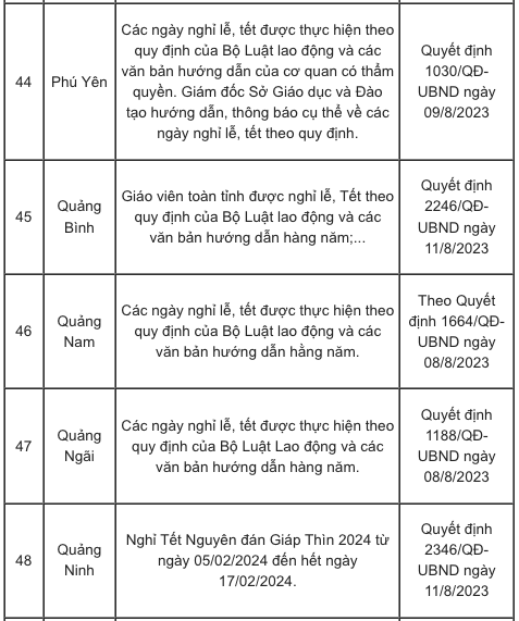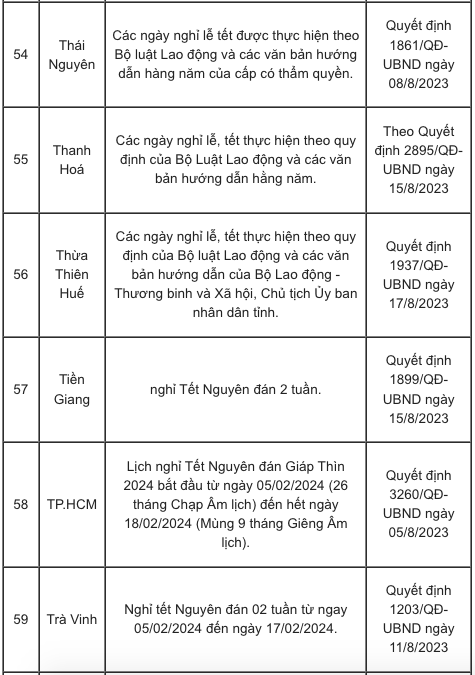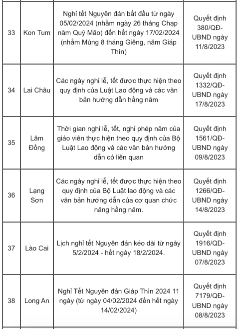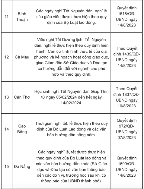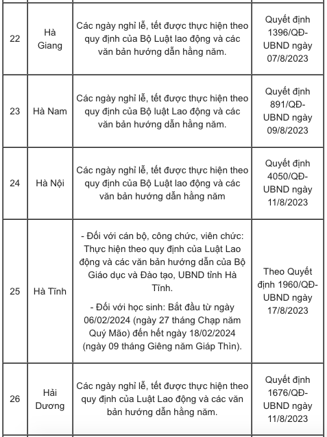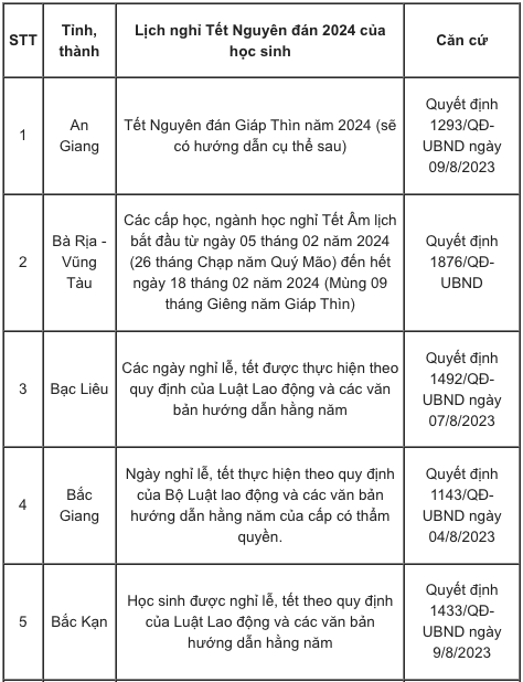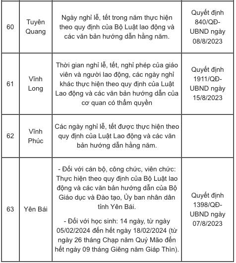 Lịch nghỉ Tết Nguyên đán Giáp Thìn 2024 của các tỉnh, thành căn cứ vào khung kế hoạch năm học cụ thể như sau: