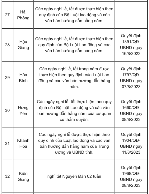 Theo thông báo của Bộ Lao động - Thương binh và Xã hội, cán bộ, công chức, viên chức và người lao động được nghỉ Tết Âm lịch năm 2024 từ thứ Năm ngày 8/2/2024 Dương lịch (tức ngày 29 tháng Chạp năm Quý Mão) đến hết thứ Tư ngày 14/2/2024 Dương lịch (tức ngày mùng 5 tháng Giêng năm Giáp Thìn).