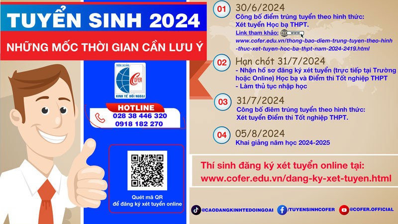 Trường nhận hồ sơ đăng ký xét tuyển đến hết ngày 31/7/2024 với hình thức xét tuyển: học bạ THPT và điểm thi tốt nghiệp THPT. Trường sẽ công bố điểm trúng tuyển theo hình thức điểm thi tốt nghiệp THPT vào 31/7/2024. Ngày nhập học chính thức là ngày 05/8/2024.