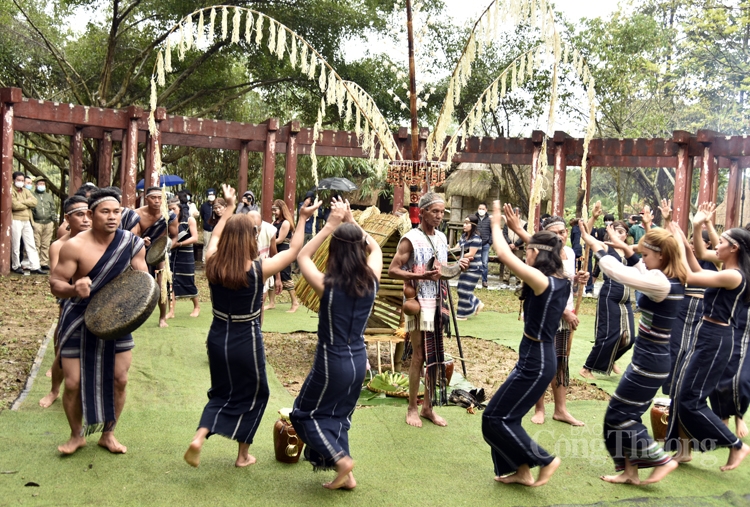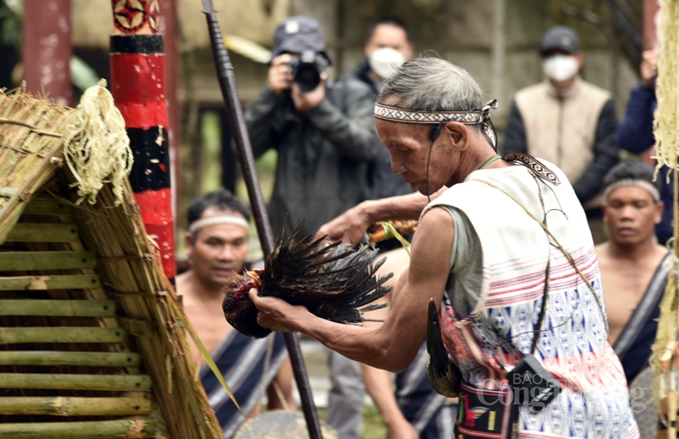 Sau nghi thức hiến sinh và dàn chiêng đã được hạ xuống, các thành viên dự hội cùng tấu chiêng và múa xoang một vòng quanh cây nêu. Già làng làm thủ tục khai ché, rót rượu dâng lên Yàng và các thần linh, sau đó mời rượu, đeo vòng cườm, còong đồng may mắn, cầu sức khỏe cho các thành viên tham dự lễ hội trong không khí ấm áp và gần gũi.