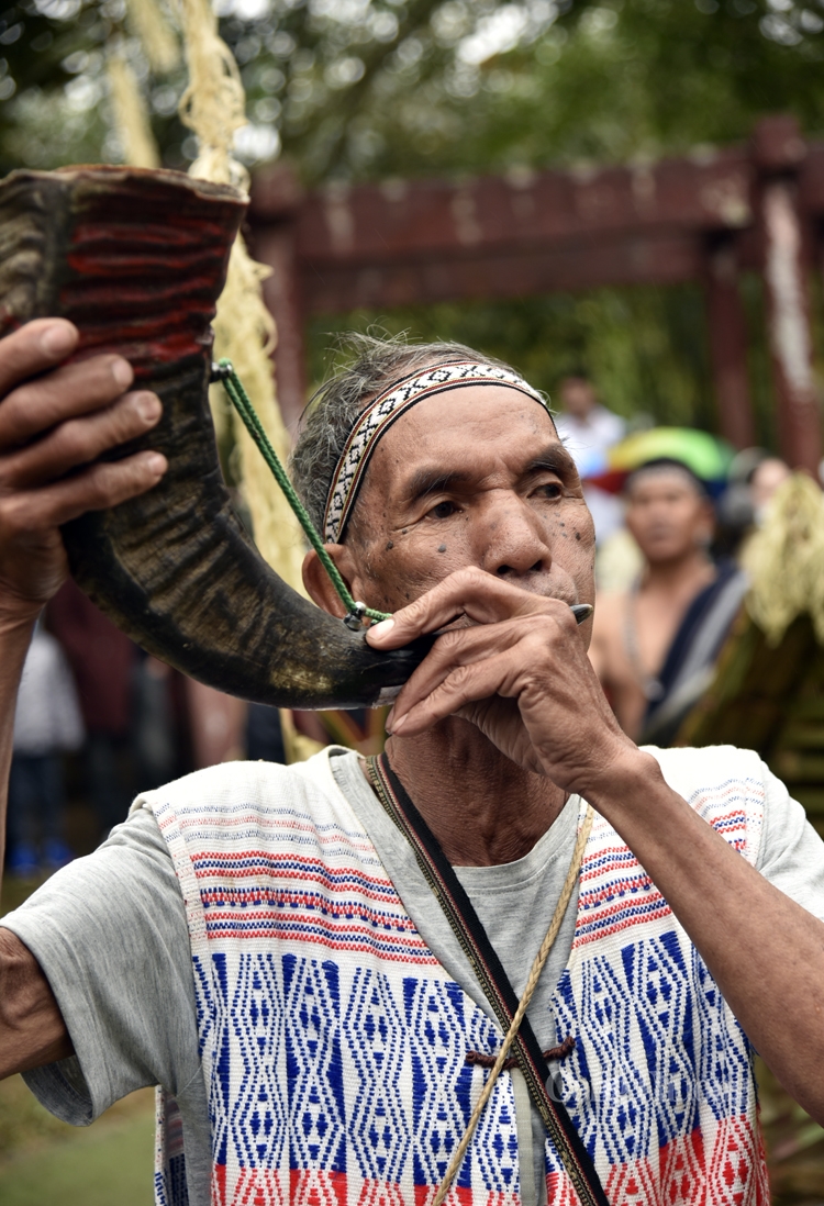 Già làng thổi tù và xin thần linh cho tổ chức lễ mừng lúa mới