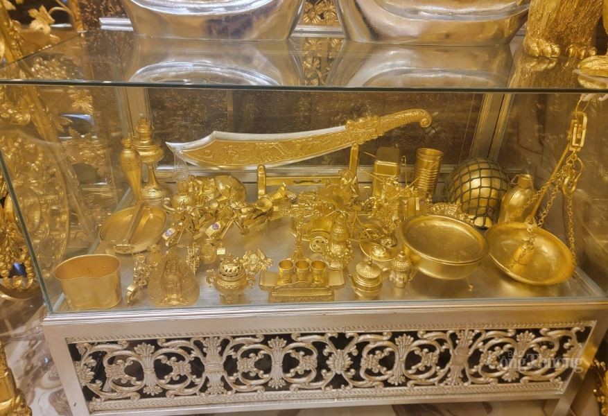 Khi bước vào bên trong, không gian nội thất khiến bất kỳ ai cũng phải choáng ngợp. Phòng khách được thiết kế rộng lớn với trần cao, treo những chiếc đèn chùm pha lê dát vàng rực rỡ. Toàn bộ bàn ghế, khung tranh và tay vịn cầu thang đều được chế tác tinh xảo và phủ vàng óng ánh. Những bức tượng nghệ thuật như Phật Di Lặc, chiến binh La Mã và đặc biệt là tượng Hulk khổng lồ cao hơn 3 mét cũng được dát vàng, tạo điểm nhấn độc đáo cho ngôi nhà. Nhằm phục vụ khách tham quan, chủ nhân ngôi nhà còn thiết kế những khu vực check in vô cùng sang chảnh như ghế thần bài, vua sầu riêng…