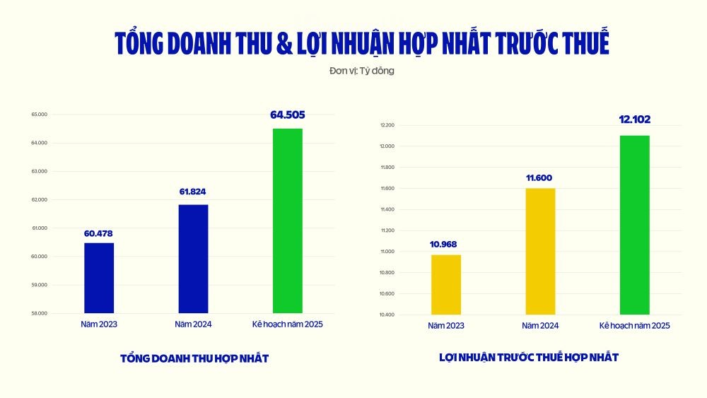 Ngày 25/4/2025, Công ty Cổ phần Sữa Việt Nam (Vinamilk) đã tổ chức Đại hội đồng cổ đông (ĐHĐCĐ) năm 2024. Hội đồng quản trị nhấn mạnh chiến lược đổi mới sản phẩm, công nghệ và tiếp cận người dùng. Đồng thời, dựa trên kỳ vọng tình hình vĩ mô cải thiện trong năm 2025, công ty đặt mục tiêu tăng trưởng 4,3% cho cả doanh thu và lợi nhuận trước thuế.