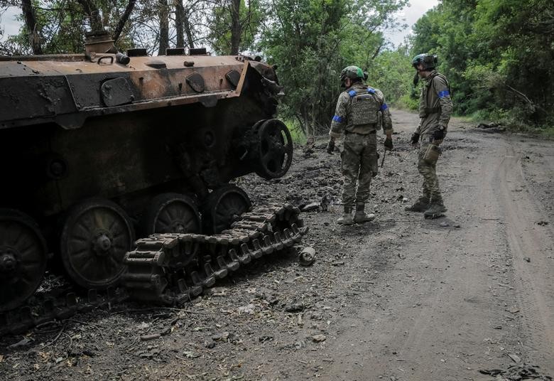 | Binh lính Ukraine đang soát xét một chiếc xe chiến đấu bộ binh Nga loại BMP-2 bị phá huỷ tại làng Storozheve thuộc tỉnh Donetsk - Ảnh: Reuters |