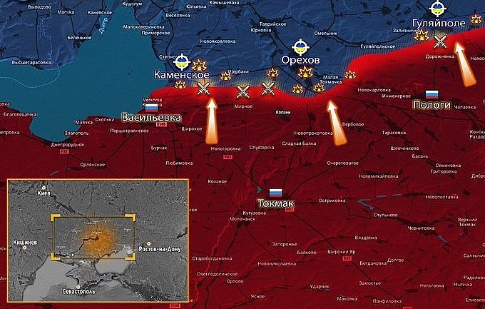 | Quân đội Nga và đồng minh đang mở mặt trận mới ở Zaporozhia khiến Ukraine phân tán lực lượng để không thể tiếp cứu mặt trận Donetsk. Ảnh: Lenta |