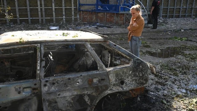 | Một chiếc ô tô bị cháy sau khi tên lửa của Ukraine tấn công tòa nhà chung cư ở thành phố Kursk. Ảnh: Sputnik |