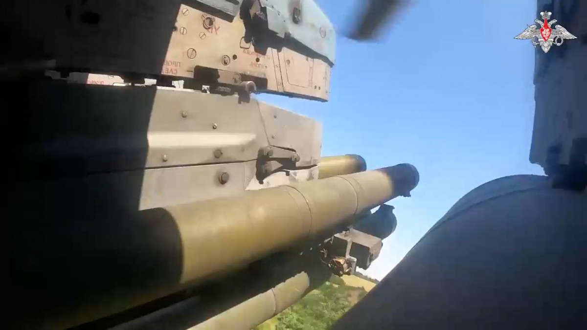 Đoạn video do Bộ Quốc phòng Nga chia sẻ cho thấy 2 chiếc trực thăng bay ở tầm thấp và bắn nhiều loạt rocket nhằm về phía lực lượng Ukraine.