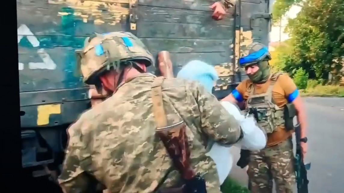 Đoạn phim cho thấy các chiến binh vũ trang Ukraine đang hộ tống những người đàn ông Nga - một số người trong số họ bị đánh đập, bịt mắt và trói tay - từ nhà riêng và đẩy họ lên xe tải. Họ được cho là thường dân bị bắt cóc ở làng Goncharovka, cách biên giới Nga-Ukraine khoảng 8km.