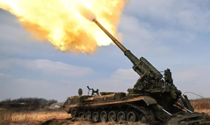 | Pháo tự hành 2S7M Malka Nga tập kích vị trí Ukraine. Ảnh: Bộ Quốc phòng Nga |