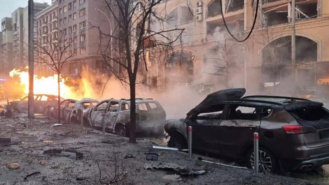 | Hiện trường một cuộc tấn công bằng tên lửa và UAV của Nga vào Kiev. Ảnh: Hãng tin AA |