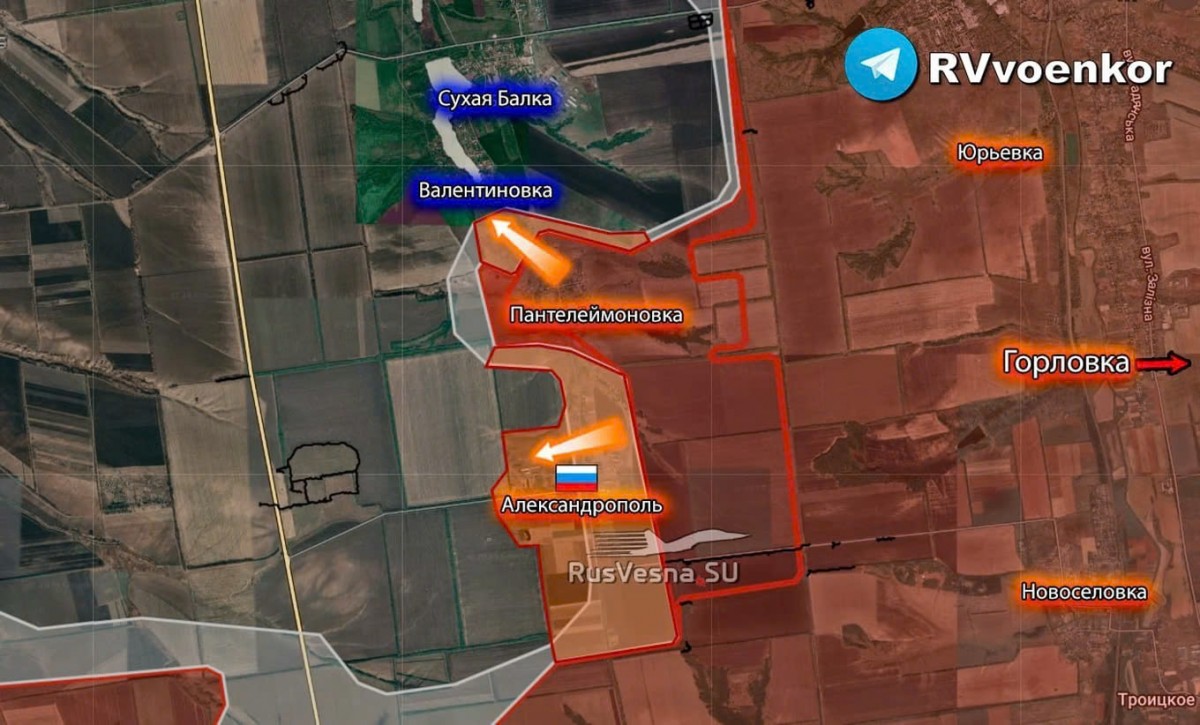 Các báo cáo cho thấy, quân đội Nga đã kiểm soát Alexandropol và Panteleimonovka mà không gặp trở ngại lớn, đồng thời mở rộng tấn công vào Valentinovka và Sukha Balka. Lực lượng Ukraine tại đây chủ yếu dựa vào bộ binh cơ giới nhỏ do thiếu sự hỗ trợ từ các đơn vị thiết giáp.