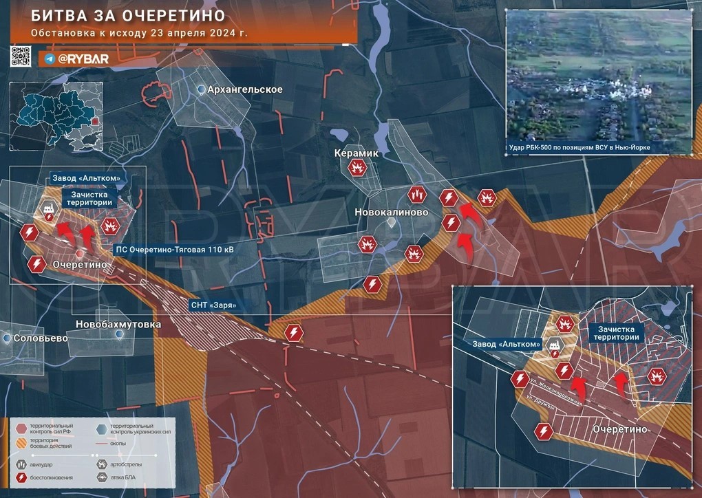 Về thông tin chiến sự, tại hướng Avdeevka, Bộ Quốc phòng đã thông báo kiểm soát được Ocheretino và các đơn vị xung kích Nga tiến vào Novobakhmutovka khiến phòng tuyến Ukraine ở mặt trận này đang thủng nhiều lỗ lớn.