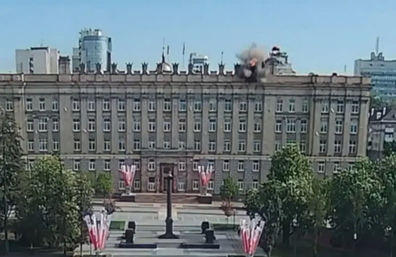 | Một máy bay không người lái của quân đội Ukraine đã tấn công vào tòa nhà chính quyền vùng Belgorod ngày 9/5. Ảnh: Topcor |