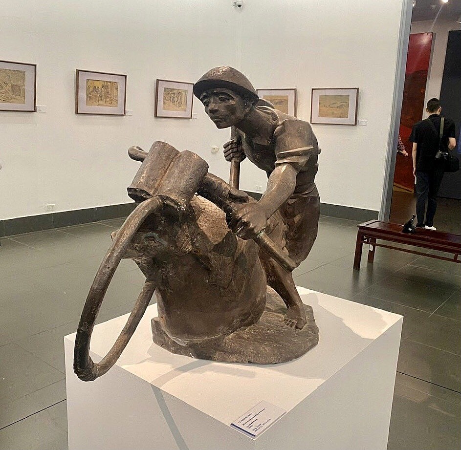 Được trưng bày tại vị trí trung tâm của phòng triển lãm, tác phẩm “Cả nước ra trận” của nghệ sĩ điêu khắc Lưu Danh Thanh để lại ấn tượng sâu sắc với khán giả. Với chất liệu bằng đồng, tác phẩm thể hiện hình ảnh người dân công hỏa tuyến đang gồng mình đẩy chiếc xe thồ chở lúa gạo lên tiền tuyến với ý chí và sự quyết tâm giành độc lập tự do cho Tổ quốc.